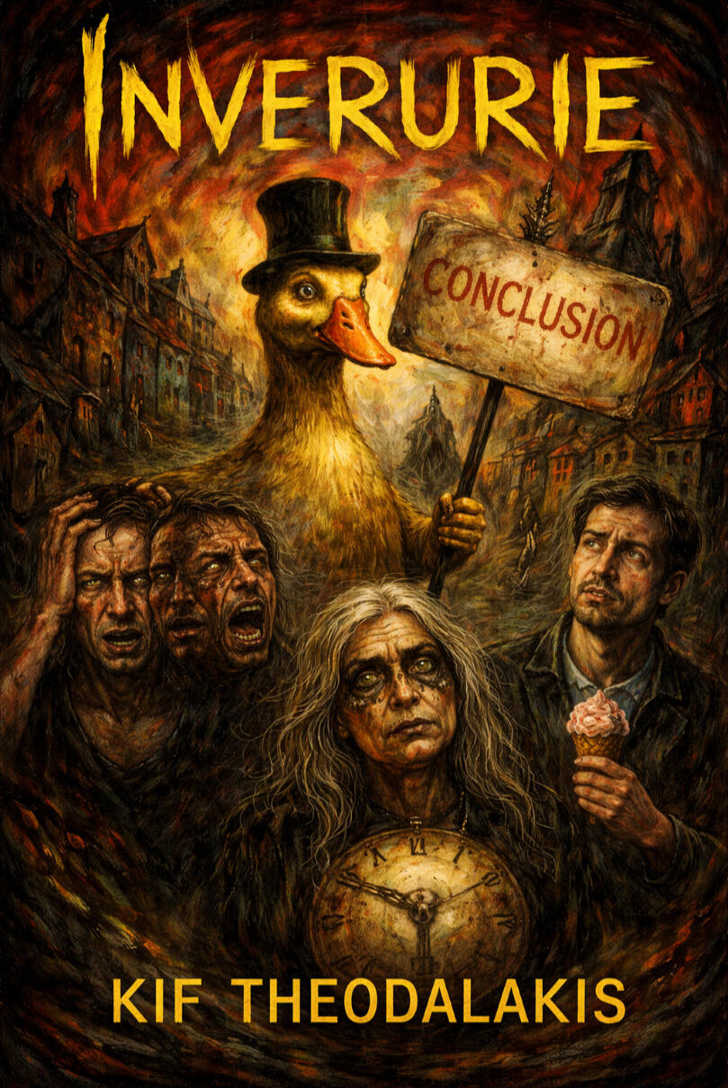 The world in Inverurie has slipped out of place. Not enough to break, just enough that nothing sits comfortably anymore. At the edge of each street there’s a murmur that something has come loose and is quietly spreading.A woman walks by sounding like a clock, her every movement counting down to something no one will admit is coming. Rafe is there and not there, his face never quite the same, as if he’s made from nothing and everything.Mr Duckington turns up again and again, impeccably dressed, wordless in his porcelain bath, as if his only purpose is to arrive and refuse to explain himself. People disappear. Days repeat themselves with tiny, unnerving changes.Inverurie is surreal, melancholy, darkly funny and deeply unsettled — a place where the questions won’t stop: who is she, why does he keep changing, why won’t the duck speak and what, exactly, is quietly falling apart - and what is Inverurie?